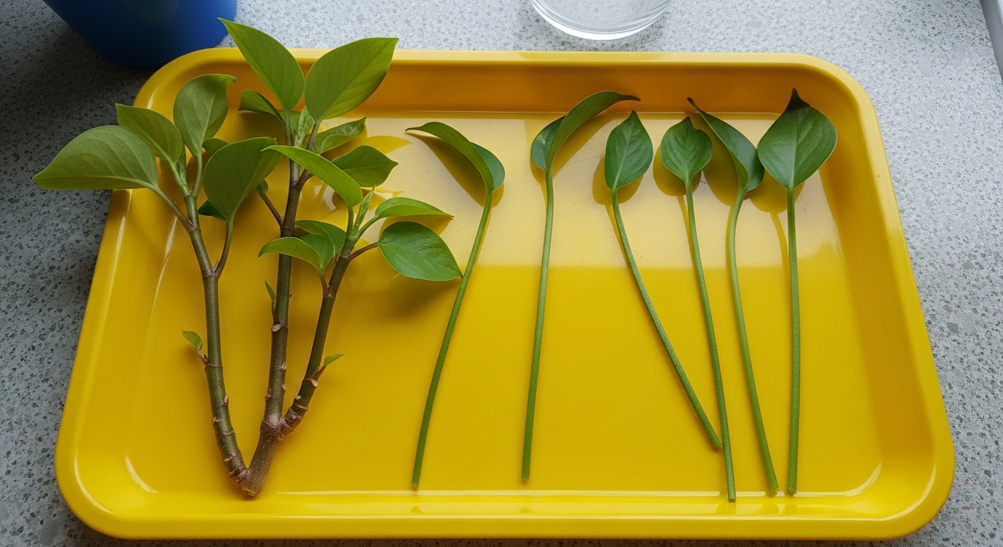 Отрежьте здоровый стебель с одним или несколькими узлами. При этом убедитесь, что на нем есть несколько здоровых листьев. Отрежьте черенок длиной около 10-15 см и поместите его в прозрачный контейнер с водой так, чтобы узел черенка был погружен в воду, а листья не касались ее. Поставьте контейнер в светлое место и регулярно меняйте воду, чтобы она оставалась свежей. Примерно через 2-4 недели вы заметите как постепенно будет происходить наращивание корней в воде. А когда корни отрастут и достигнут 5-7 см, черенки можно будет пересаживать в горшок с грунтом.