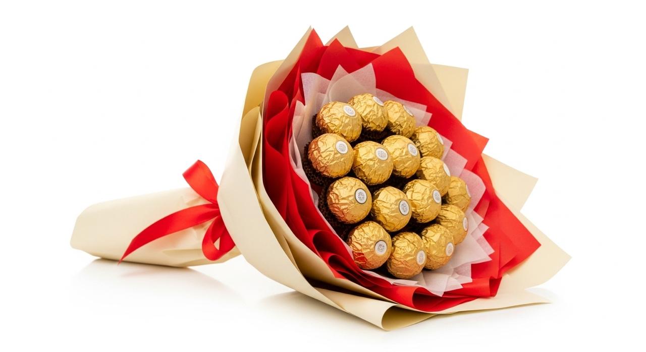 Для леди можно создать элегантный и изысканный букет. Выберите конфеты премиум-класса с разными вкусами: шоколад, пралине, трюфели. Для компактного подарка достаточно 10–15 конфет. Если есть желание удивить масштабом, то понадобится 40–50 сладостей.
